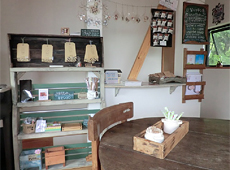 ▲ゆめハウスはスタッフが夢を育てる場所でもある。イチジク茶やゆめ玉ストラップ、木工品などグッズが並ぶ喫茶ルーム |