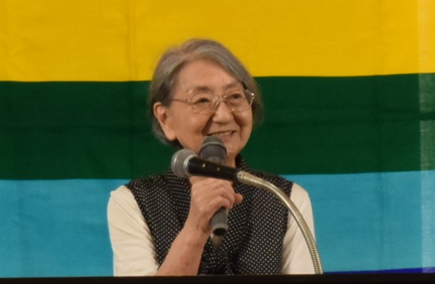 土崎港被爆市民会議の伊藤津紀子氏による「土崎空襲について」の講演では、当時4歳だった伊藤氏が一夜にして住まいを失い、近所に住んでいた多くの方が亡くなったことなどの生々しい体験談や、伝え継がれてきた記憶を話してくださいました。戦争体験を若い世代につないでいくことの重要さと、「戦争が二度と起こらないようにこれからも元気に活動を続けていきたい」との強い想いを語られました。